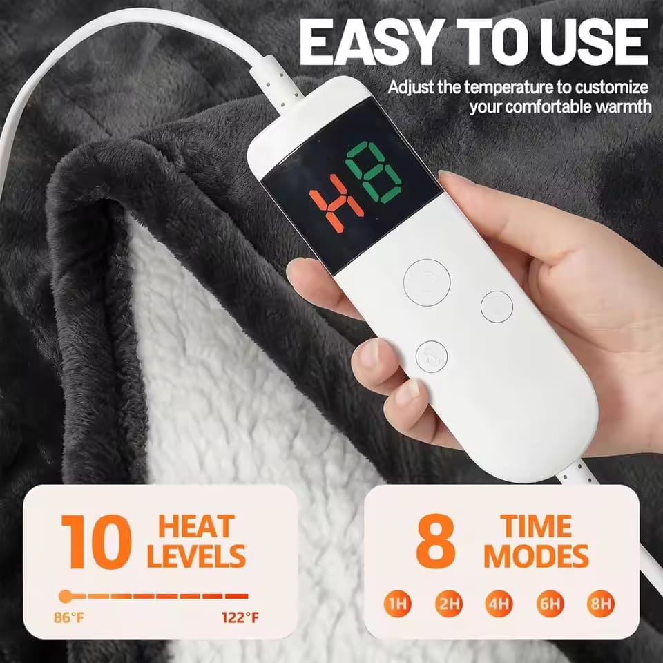 Style Chinese Luxury Fabric: Expertly made with 220 GSM flannel and 220 GSM sherpa, this heated blanket offers an ultra-soft texture. It features a non-shedding electric blanket design with a discreetly integrated 2.2mm heating wire, providing substantial warmth without being obtrusive, ensuring maximum comfort. User-Friendly Operation: Offering ten different heating levels with a temperature range from 86 to 122 degrees Fahrenheit, this blanket is easy to control with a simple one-button operation. It includes an eight-hour auto shut-off feature for safety and can be used on beds, sofas, or in offices without hindering movement. It's perfect for personal use or as a considerate gift. Safety First: The heated blanket is equipped with overheat protection to ensure safety. If it becomes too hot, it will automatically switch off. Avoid using the blanket while it's being tumble dried or dried in the sun. Maintenance: This heated blanket is fully machine washable, making it easy to clean. Remember to detach the controller before washing and use a gentle cycle. For drying, air-dry or tumble dry on low heat to preserve the quality. Ensure the blanket is completely dry before reconnecting it to power. ```